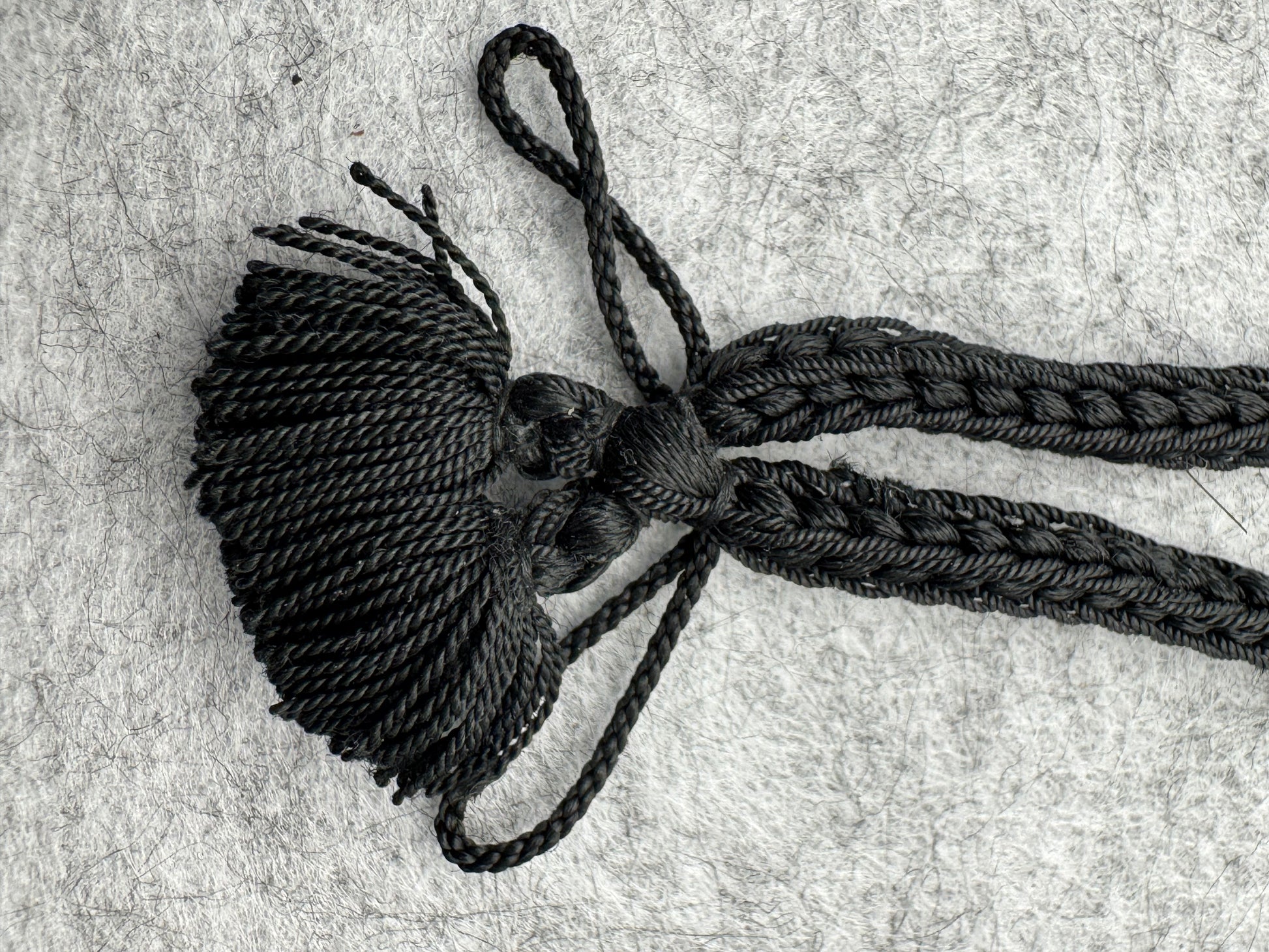 Seltene japanische Uhrenkette mit emailliertem Metallclip (Krawattenklammer) und Kordel aus schwarzer, geflochtener Kunstseide.